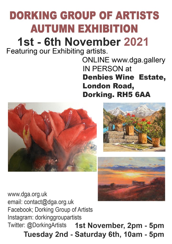 On Monday 1st November the Dorking Group of Artists opens it’s new exhibition at the Denbies Wine Estate. I always look forward to this one as it is a large exhibition, with over 200 works to look at. So something for every taste and the Private view is always fun to attend and to meet friends and buyers. I have exhibited with this Group since 2009, my very first exhibition! I find that the strictures of presenting work to the public really ups your game and, looking back, I think it has had a very positive influence on my working practice.