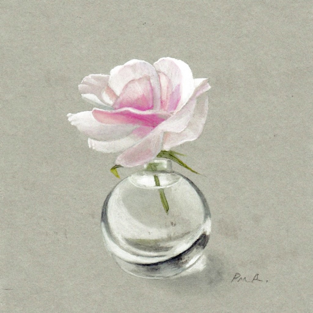 Pink Rose Watercolour on grey paper £50 in white mount 20 x20cms