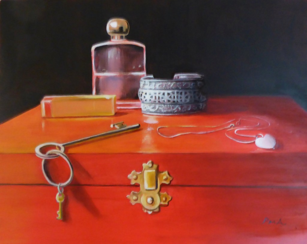 At this time of the year I am a bit more reluctant to be outdoors unless the weather surprises me and is reliably pleasant, which is uncommon in December! However I take great pleasure from the small things around me at home that I have accumulated because they interest me. Their shapes, colours and their meaning to me. Inevitably a new composition for a painting emerges which makes me see them in a new light(often literally). This is one I am working on at the moment, rich colours emerging from the dark space. Not quite finished yet.