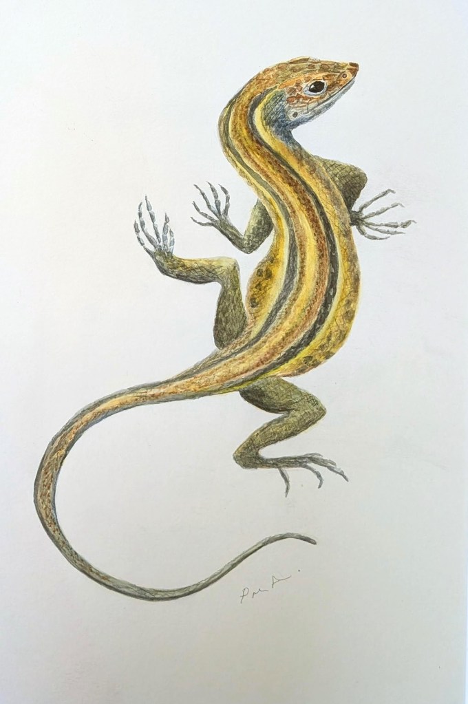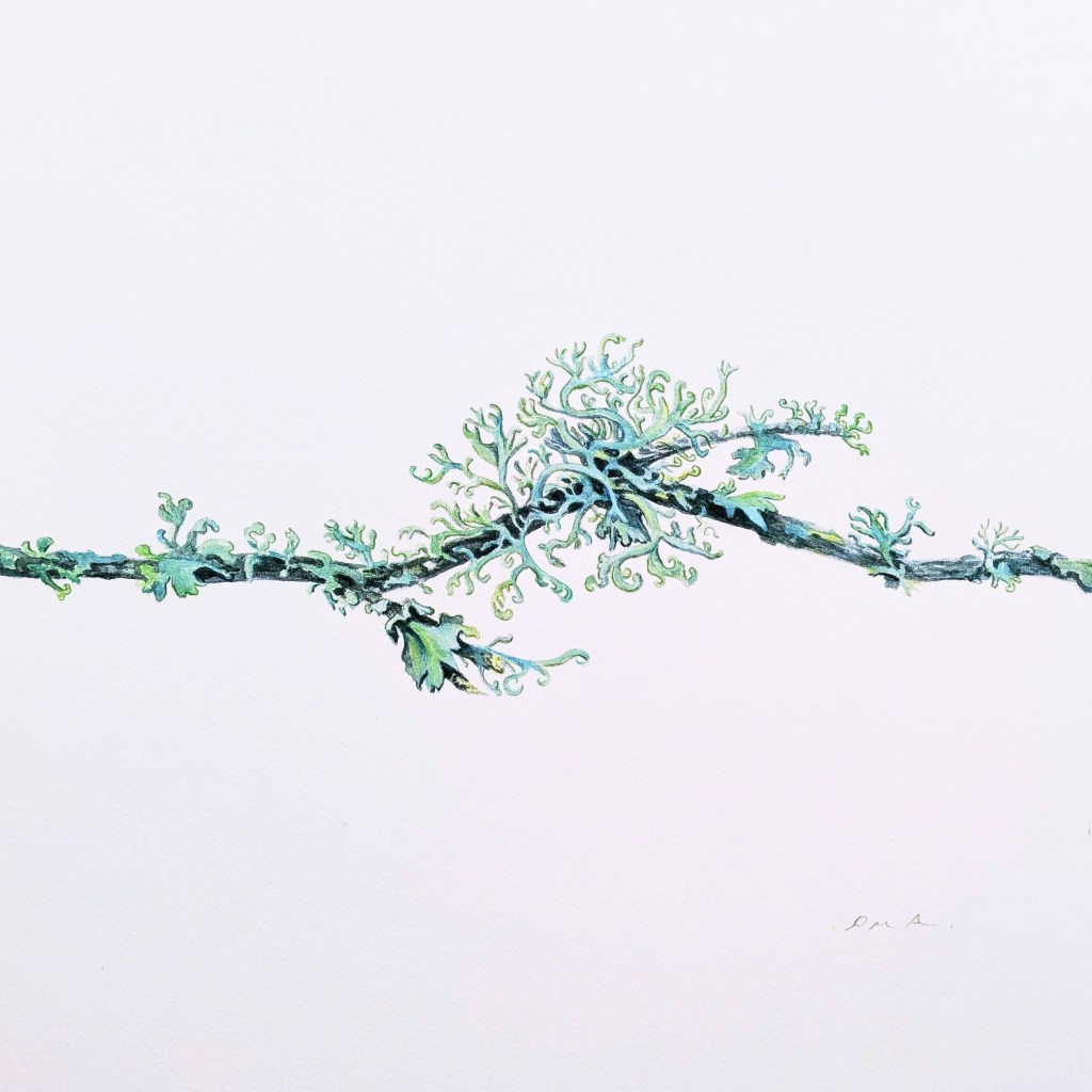 Lithe Lizard £95 Watercolour on white paper in ivory mount and limed wood frame 33 x 43 cmsLichen Landscape £250 watercolour on white paper in ivory mount and frame 55 x62cmsPomegranate Watercolour £95 on white paper in white mount